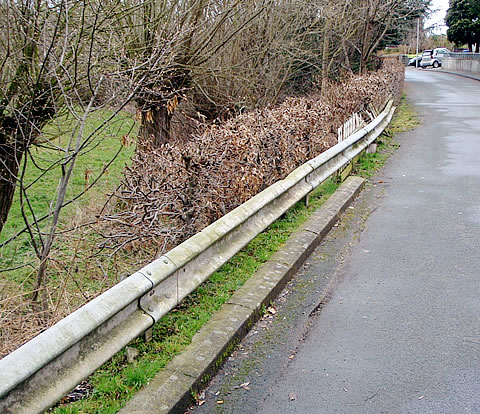 Maßnahme: Die Uferböschung des Bachlaufes angrenzend an die Anliegerstraße war instabil und rutschte ab. Zur Sicherung der Uferböschung wurde eine Winkelstützmauer aus Stahlbeton vorgesehen.